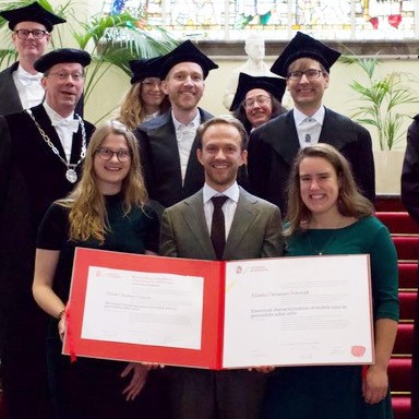 Moritz Schmidt successfully defended his thesis at the University of Groningen. He conducted his research in the Hybrid Solar Cells group of Bruno Ehrler, focusing on mobile ions in perovskite solar cells, which is quite a challenge. Moritz introduced an intuitive way to measure mobile ions. The method works a bit like freezing and melting water. When water freezes, it stops flowing. In the same way, when a solar cell is cooled down, the mobile ions stop moving.