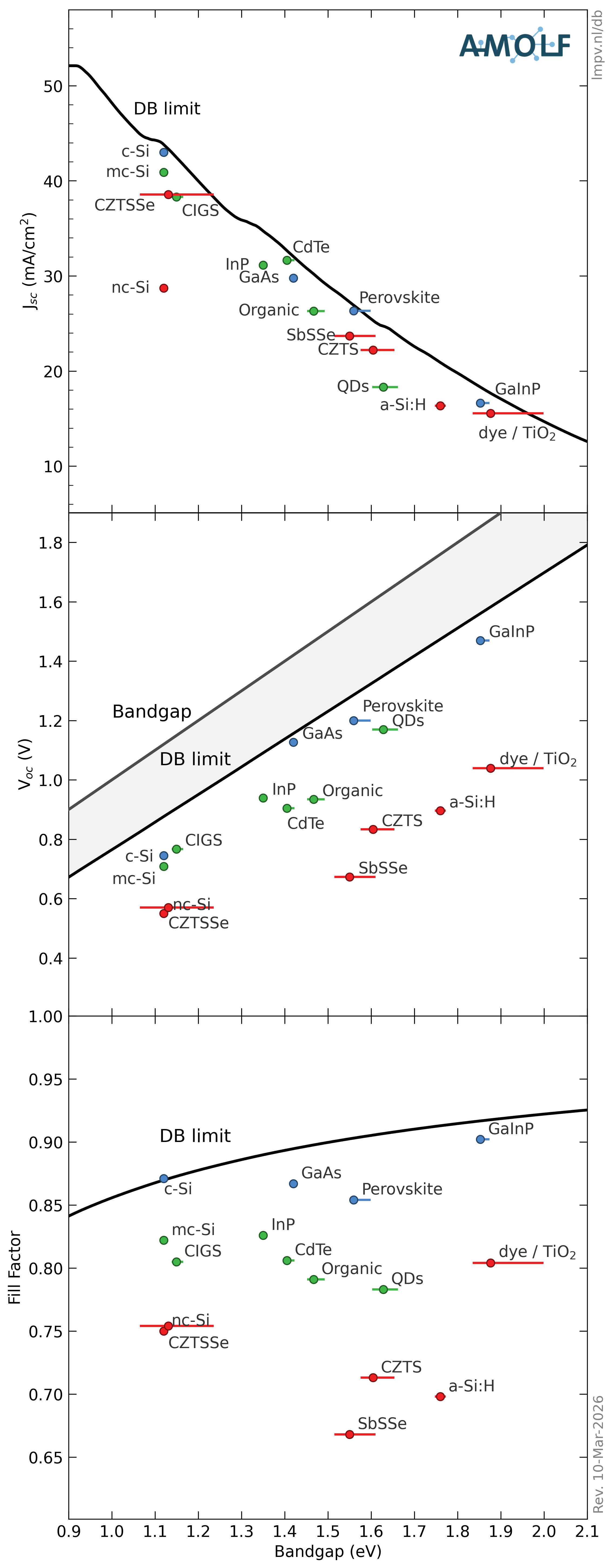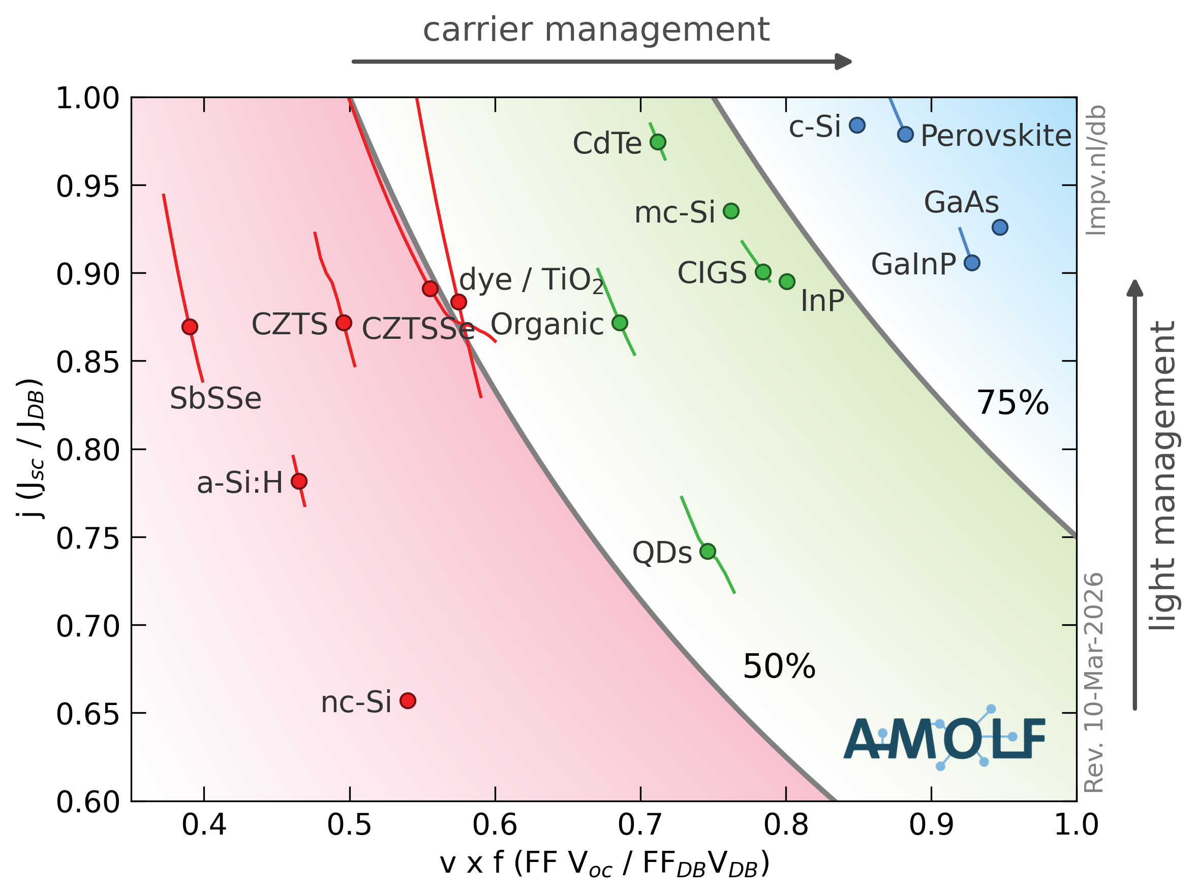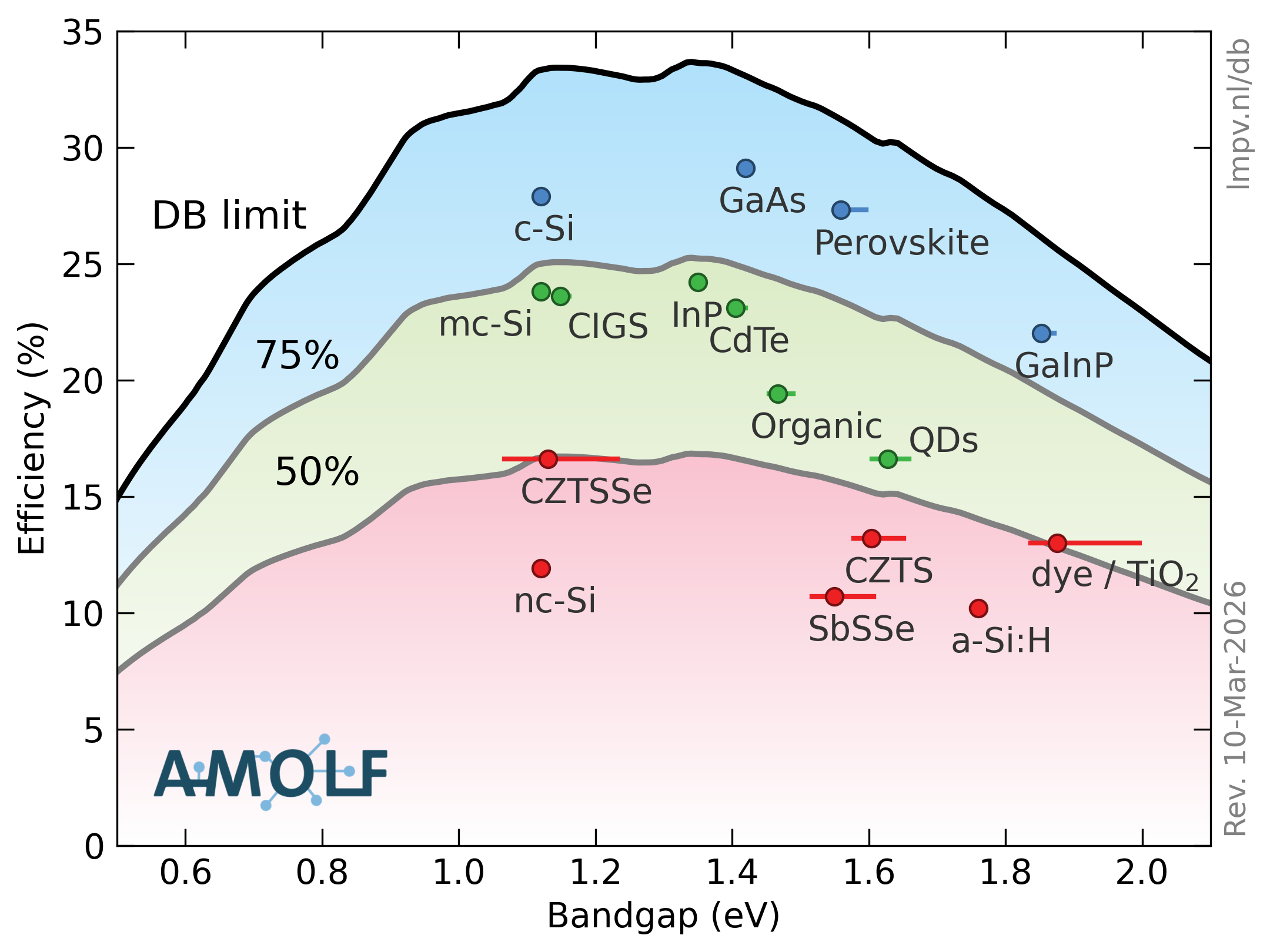 The figures shown below provide an up-to-date comparison between world-record solar cell efficiencies for different materials and the fundamental detailed balance efficiency limit.