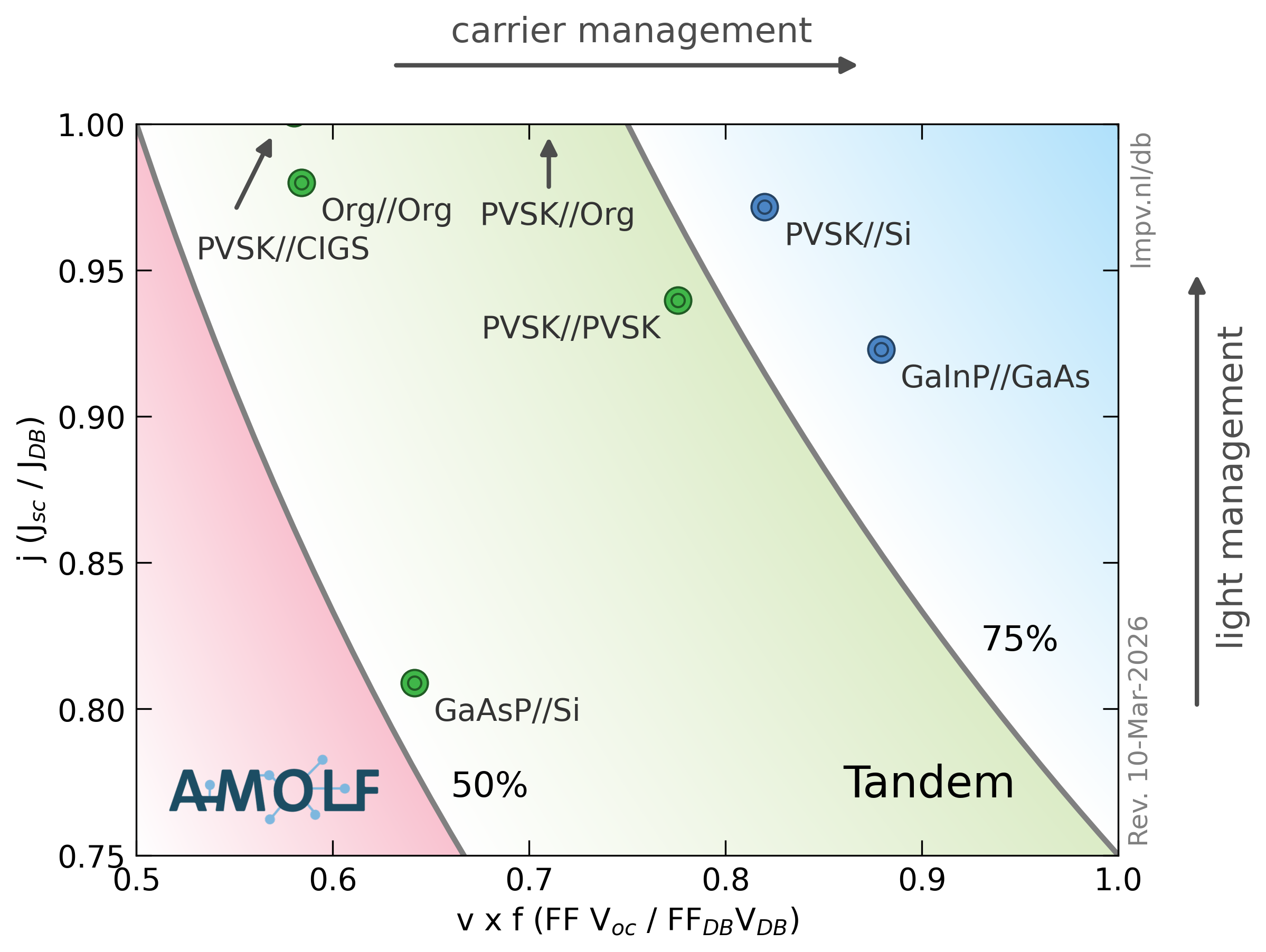 The current ratio j = Jsc/ JDB plotted versus the product of the voltage and fill factor fractions (v x f = FF Voc / FFDB VDB) for record-efficiency cells. The labels correspond to the top//bottom subcell materials of the tandem cell.